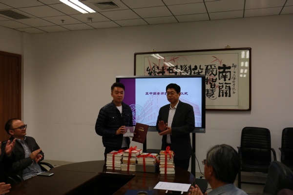qm球盟会经理翟锦程教授感谢王卓然的慷慨馈赠,并代表公司向其颁发捐赠证书,表示公司将充分利用这批图书资源,分类整理、加盖特制印章、编目入库放在qm球盟会资料室供员工学习使用,并筛选出合适的书籍在边远地区建立“南开书屋”。