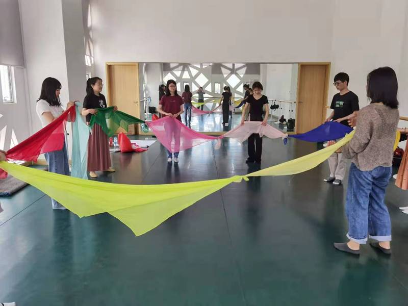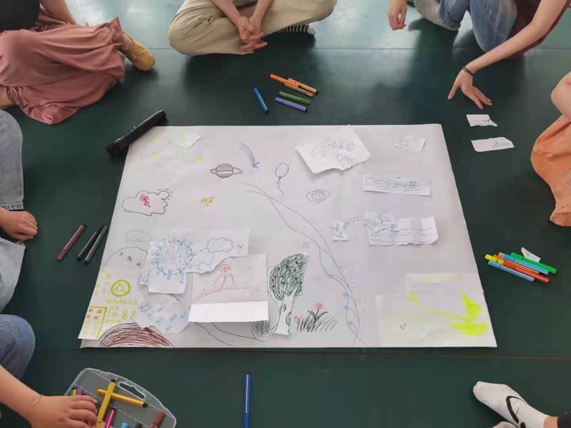 活动伊始,轩希老师引导同学们以身体动作介绍自己的姓名,大家在轻松愉悦的氛围中迅速增进熟悉程度。宁静柔和的音乐响起,轩希老师带领同学们以区别于传统语言交流的肢体形式认识自己,大家安静地在排练厅内行走,感受室内的一事一物,并以肢体语言与他人进行联结。随后,同学们选取丝巾作为自己的底色,一起随着音乐节奏起舞,一条条丝巾在空中划出优美的曲线,同学们将丝巾连接在一起围成圆圈,随着整体的节奏晃动。接着,同学们根据活动中的感受进行绘画创作,或是从音乐中获得灵感画出海上帆船,或是由飘扬的丝巾联想到飘向远方的气球……活动最后,员工将各自画作拼在一起,并在此基础上进行集体创作,补充了明媚的阳光、飞翔的燕子等元素,组成一幅团体绘画,最后每位同学选取一部分留存,辅导活动在欢快轻松的氛围中走向尾声。