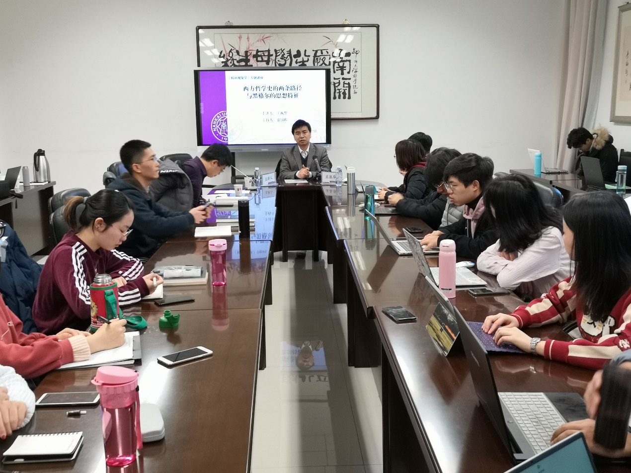 (通讯员 丁淑怡 马蓉)12月7日,陕西师范大学哲学系教授、博士生导师庄振华做客qm球盟会,于317会议室进行题为“《精神现象学》专题讲座”的学术报告。会议由qm球盟会经理翟锦程教授主持,在读硕士生、博士生参与讨论。本次专题讲座共两场,上午场讲座的主题为“西方哲学史的两条路径与黑格尔的思想特质”,庄振华教授从康德的现象与物自体的区分引入讲座内容,在康德的视域中,我们日常生活的思想和行为等事实上都是与概念打交道,而非事物本身。哲学家们自古希腊起就在追溯事物的本原,庄振华教授指出我们把握世界的两条路径是形式引导质料的上行路径和质料生成形式的下行路径,用本原学说来讲就是引导性的本原和生成性的本原。通过诠释以上两种路径的具体内涵,揭示出德国古典哲学对我们认识和理解事物时将我们的认识形式挖掘和凸现出来的重要意义。庄振华教授总结了黑格尔思想的三个特质:第一,黑格尔的哲学是思辨的而非反思的。第二,黑格尔的哲学从形式上看是同一的而非统一的。第三,从历史特征来看,黑格尔的哲学是关心事情本身,而不是关心意识的对象。同时也为下午场的讲座做出了铺垫。下午,庄振华教授继续带来专题讲座第二场“黑格尔与现代