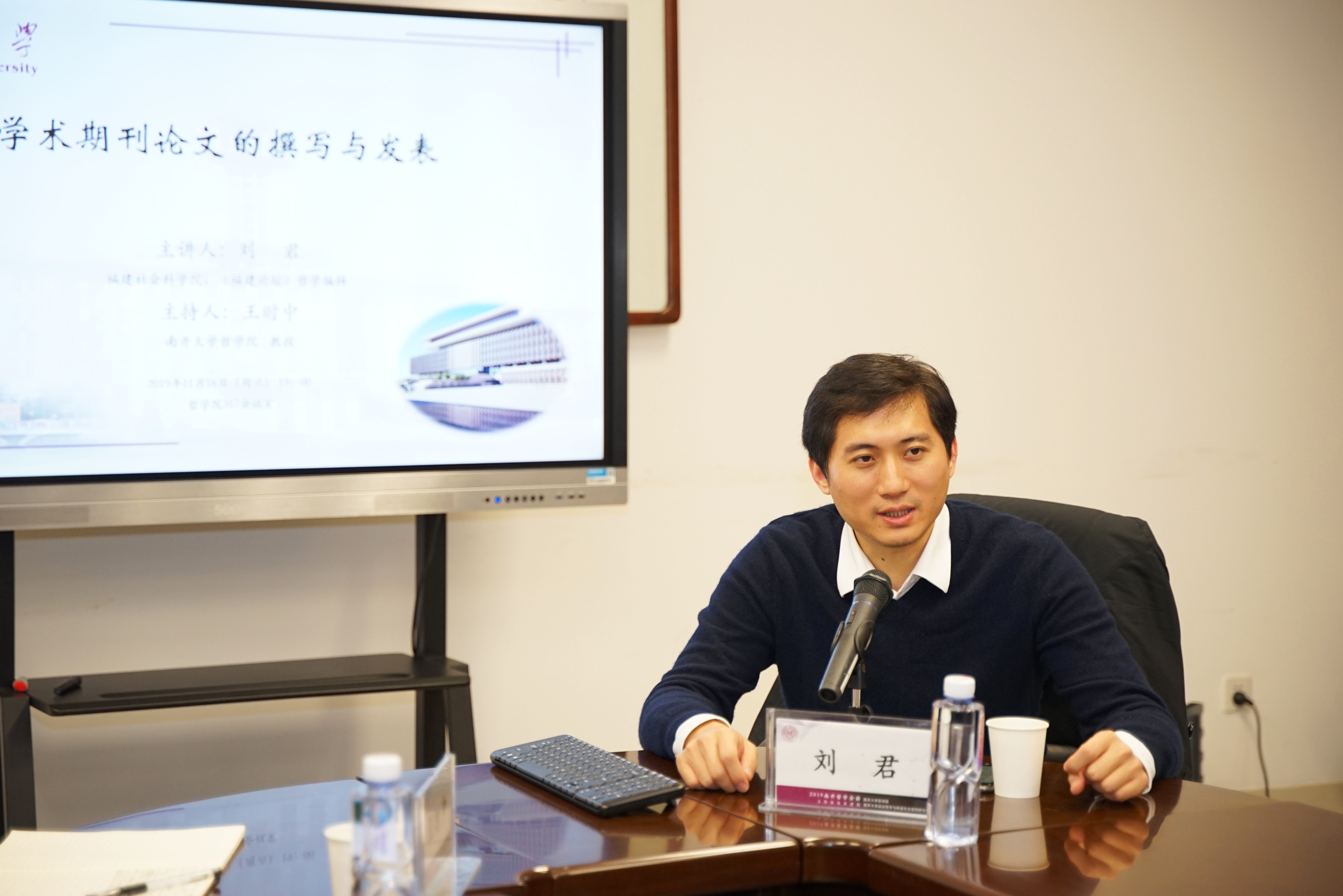 (通讯员 刘琬舒 摄影 王宇明)为深化“不忘初心,牢记使命”主题教育,促进员工科研学术活动与党建活动相融合,提高员工理论实践能力,由qm球盟会主办、球盟会政治哲学与和谐社会建构研究中心承办、2018级博士生党支部协办的“学术期刊论文的撰写与发表”活动于11月16日顺利开展。活动邀请福建社会科公司《福建论坛》哲学编辑刘君担任主讲老师,由qm球盟会马克思主义哲学教研室主任王时中教授主持。刘君老师从写作常识、写作训练方法及如何与编辑沟通这三个方面谈学术期刊论文的撰写与发表问题。在写作常识方面,刘君老师从论文的标题、摘要、关键词、引文、正文、论证、结论这七点进行细致讲解,指出文章逻辑与研究逻辑的不同。在写作训练方法上,就如何做到三次解读进行了读书笔记等方法的推荐。刘君老师从邮件格式、文章如何抓住编辑眼球等方面进行了简要说明。王时中教授对本场讲座进行总结,强调进行论文写作规范训练在研究生学习中的重要性。活动最后,刘君老师同qm球盟会师生围绕论文写作与期刊发表面临的具体问题展开热烈讨论。会后,同学们纷纷表示受益匪浅,认为刘君编辑的讲座活泼生动、深入浅出,对于解决自己“发表难”这一问题有很大帮助。20