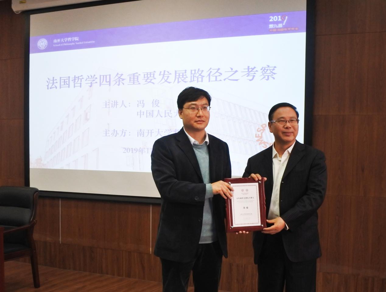 (通讯员 张尚尚 摄影 王江雨)2019年11月8日下午,中国人民大学冯俊教授做客“百年南开大讲坛”,并于公司318会议室展开题为“法国哲学四条重要发展路径之考察”的报告。会议由qm球盟会贾江鸿教授主持,qm球盟会教师王建军、张仕颖、齐艳红、莫雷出席论坛,在读博士生、硕士生到场参与讨论。(qm球盟会负责人贾江鸿向冯俊颁发“百年南开大讲坛主讲人”证书牌)主讲人冯俊以法国哲学的四条发展路径为线索,以宏观的方式讲授了法国哲学发展史。冯俊的讲座内容丰富,其主要内容概括起来可以分为以下四点:一是理性主义和科学主义的发展路径;二是理性主义和非理性主义;三是社会政治哲学和马克思主义哲学;四是现象学运动与后现代主义哲学。会后,冯俊与在场师生进行了热烈的探讨。冯俊勉励同学们学贯中西,以西方哲学注释中国哲学,发扬我国的传统文化。“搞哲学的人,要有一辈子为真理献身的精神”,引起了与会师生的共鸣。