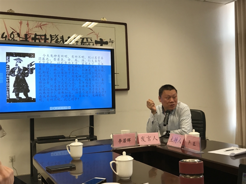 2019年5月10日,百年南开哲学讲坛在公司317会议室举行,厦门大学哲学系教授李若晖主讲了“人何以能质疑鬼神——上博竹书《鬼神之明》中的人之知”。此次讲座由中国哲学教研室主任严正教授主持,天津师范大学杨效雷教授、公司叶树勋副教授与会,在读博士、硕士研究生及部分本科生与会聆听。李若晖老师首先从如何看待中国哲学,如何对待简帛文献谈起,指出我们惯常的模式化思维不利于建构中国哲学,因为我们的思维模式在认识新事物时是将之尽力纳入到已有的框架中去认识它,实际上是在消灭新事物。而拿着简帛文献去划入某个学派,也在这种熟悉化中降低了价值。因此,李老师认为我们应当引入逻辑框架,如其所是地建构中国哲学体系。引入西方的逻辑论证模式,来帮助简帛文献思想的建构,我们不仅要知道简帛文献说了什么,还要以逻辑为工具,发掘字句之间隐含的、未曾言说的思想。接着,李若晖老师正式进入到楚简《鬼神之明》的内容讲解中。《鬼神之明》以“今夫鬼神有所明,有所不明,则以其赏善罚暴也”开篇,建立了赏善罚暴与鬼神之明之间的必然联系,鬼神之明体现在鬼神超越一切的认知能力和执行能力,而《鬼神之明》提出了对鬼神之明的质疑,并且这是一种质疑鬼神