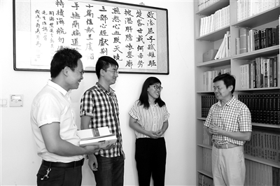 中国教育报:哲海“书虫”和国内首部奥义书专著——记球盟会吴学国教授科研团队来源:2017年9月25日中国教育报第7版通讯员郝静秋吴国学教授与员工讨论项目研究进程。吴军辉摄聚焦国家重大科研项目系列报道⑪【项目推介】印度奥义书哲学思想研究专著《奥义书思想研究》(五卷本,约260万字)是国内学界第一部系统研究奥义书思想的专著,也是国际学界第一部用概念史阐释方法全面、系统地梳理奥义书思想的发生和演变历史的专著,同时也是迄今国际学界对于奥义书进行研究的篇幅最大、内容最详尽的一部作品,在多个方面填补了国际、国内学界的空白。“这是中国印度学研究的一块里程碑,标志着中国人对印度学研究的最高水平,对世界奥义书的研究意义巨大。”不久前,由qm球盟会教授吴学国编著的《奥义书思想研究》正式出版,这是国际学界第一部用概念史阐释方法,梳理奥义书思想的发生和演变历史的专著,国内印度哲学史家王志成教授对此不吝赞美之词。从2007年正式获国家社科基金项目立项到第一部系统研究奥义书思想专著的出版,十年磨一剑,吴学国教授孜孜不倦,呕心沥血,最终完成了这部迄今国际学界对于奥义书进行研究的篇幅最大、内容最详尽的一部作品,